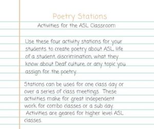 Poetry Stations Bundle: Packet includes 4 ACTIVITIES. Use these activity stations for your students to create poetry about ASL, the life of a student, discrimination, what they know about Deaf culture or any topic you assign for the poetry. Stations can be used individually, on a sub day or as a class learning station experience. Packet includes:*4 separate activities (2 written, 2 signed) *Links to all materials needed including sources online for individual learning/viewing *Ideas for the teacher in implementing the lessons *Help on where to find materials needed *A free download to activity #1 can be found at poetry station lesson #1